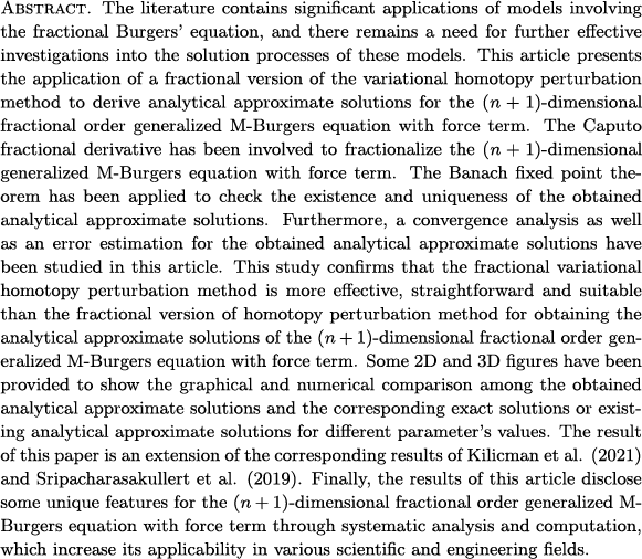 Md. Asaduzzaman, Adem Kilicman, Faruk Ozger, Hasan Bulut and Seyma Firdevs Hizal}{: Analytical approximate solutions of the (n+1)-dimensional fractional generalized M-Burgers equation through FVHP method (LNA)